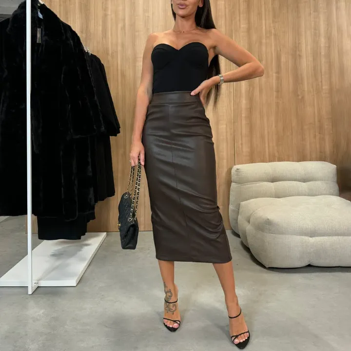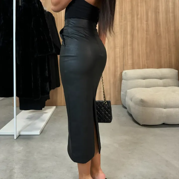 High-Waist Split PU Bodycon Skirt with Pockets
