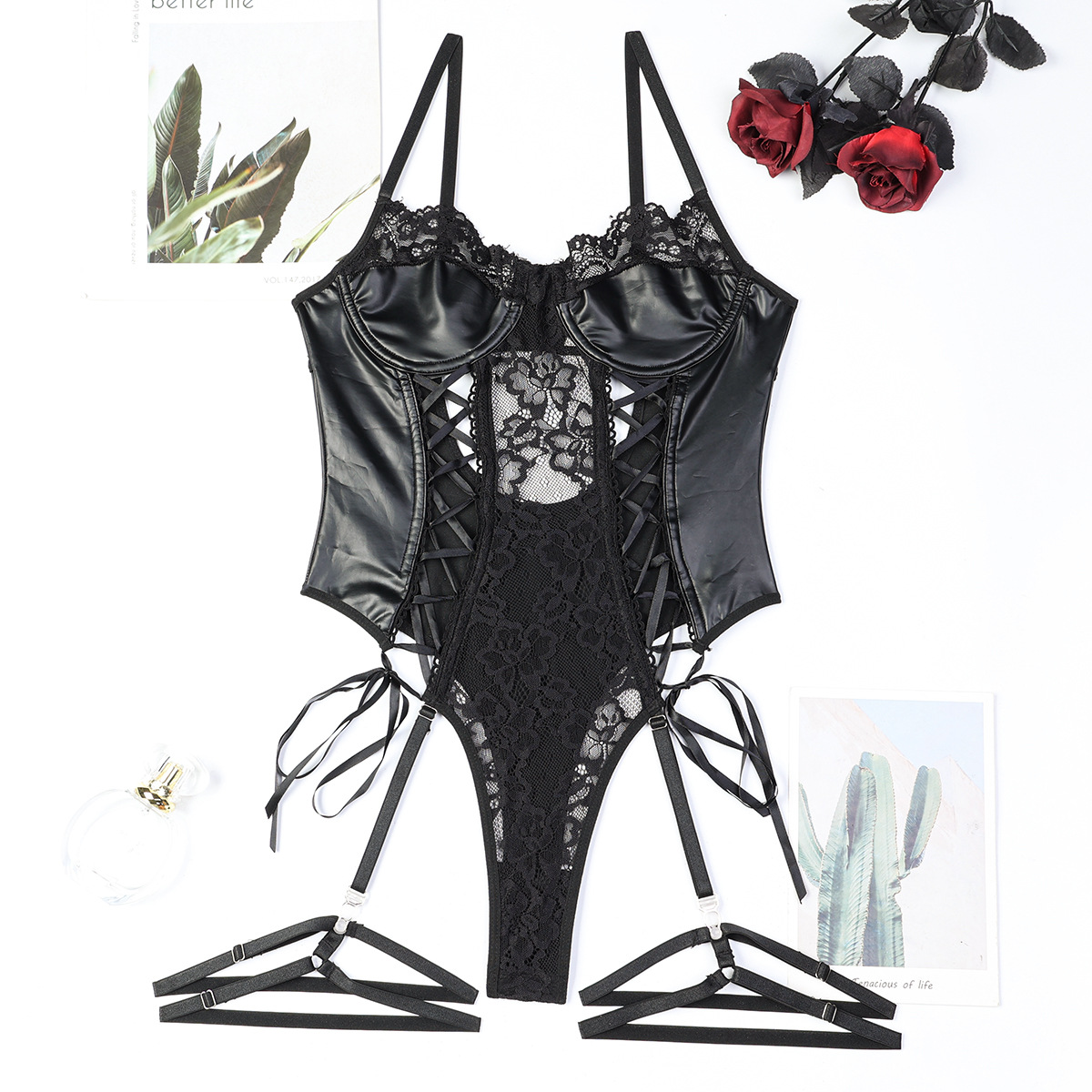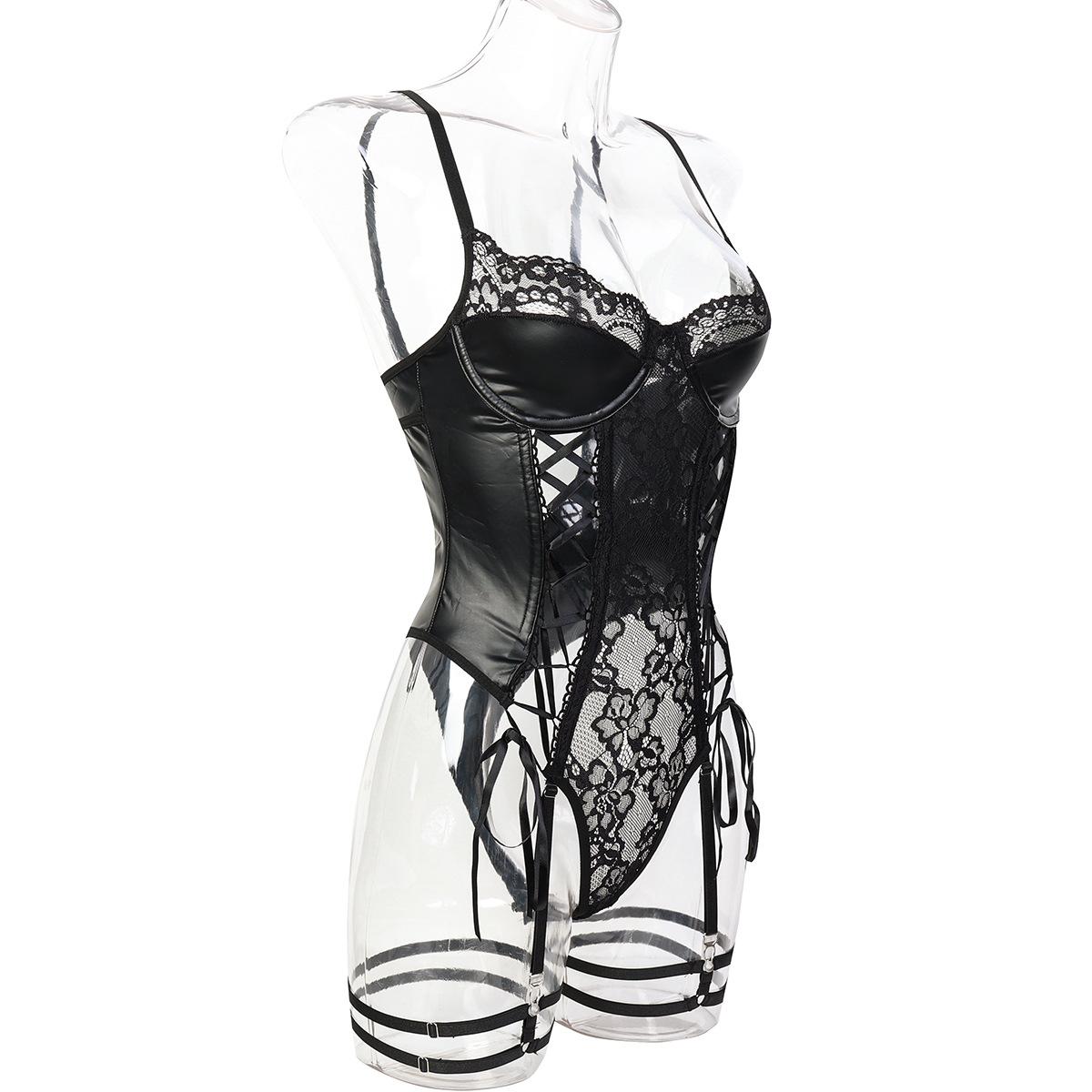 Sexy Fishnet PU Leather Erotic Teddy Bodysuit