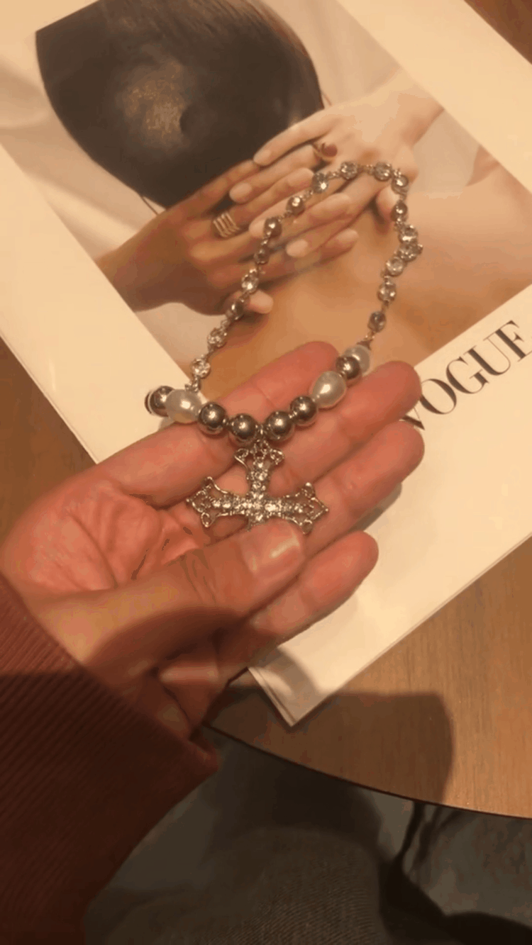 This necklace features a stunning blend of luminous pearls, polished metal beads, and sparkling crystals, finished with a detailed cross pendant. The mix of textures creates a bold yet elegant look that instantly elevates any outfit.